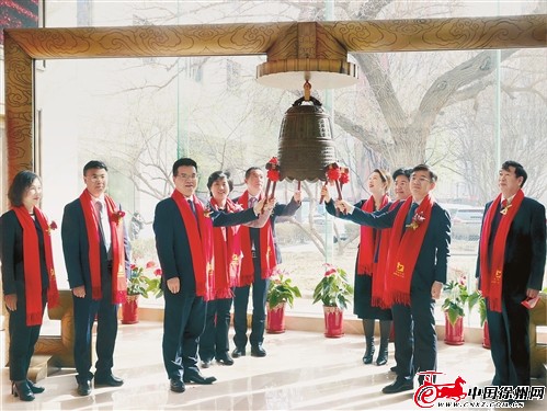 市長(zhǎng)王劍鋒等領(lǐng)導(dǎo)和嘉賓共同為“百甲科技”鳴鐘開市。 本報(bào)記者 齊浩 攝