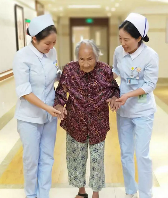 為了幫助101歲高齡的馮老太盡快康復(fù),在護(hù)理方面,護(hù)士們無(wú)微不至、時(shí)刻關(guān)懷著老太太,翻身、排便、鍛煉……只要馮老太需要幫助,護(hù)士們都會(huì)第一時(shí)間陪伴在身邊。細(xì)心的綜合外科護(hù)士們通過(guò)幾天的相處觀察,摸清了馮老太的疼痛規(guī)律和時(shí)間,極早地采取干預(yù)疼痛的措施,減輕了馮老太的痛苦。另外,馮老太因?yàn)橐郧肮∧_,步態(tài)不穩(wěn),護(hù)士們還為她買(mǎi)來(lái)了舒適的防滑鞋,細(xì)致入微的關(guān)懷與照顧,回歸護(hù)理的本質(zhì)。不僅如此,綜合外科還針對(duì)馮老太制定了高齡特殊性護(hù)理方案,采用ERAS快速康復(fù)理念,在病情允許的情況下,幫助老太太起身、下床,并采用吹氣球的方式讓肺部得到鍛煉,以避免感染。