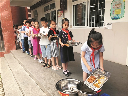 碧水灣小學(xué),孩子們自覺(jué)排隊(duì)將吃剩的東西倒入指定的垃圾桶內(nèi)。