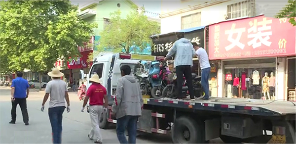 在新莊路城管局執(zhí)法人員正在將不按規(guī)定、違規(guī)停放的非機(jī)動(dòng)車進(jìn)行集中整治,對(duì)于提前告知商鋪和周邊居民后還未按規(guī)定停放的車輛,執(zhí)法人員將其拖往指定地點(diǎn)。