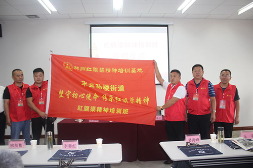 開班儀式上,紅旗渠精神教育基地崔俊峰主任向?qū)O樓街道培訓班贈書并授旗。