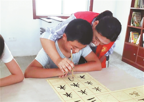 志愿者手把手教孩子們練書法。
