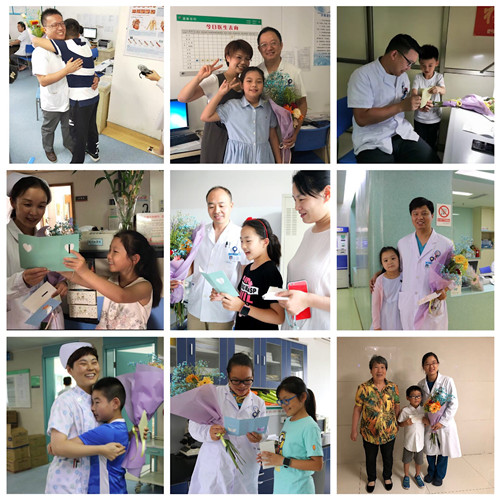 在孩子們制作禮物準備驚喜的同時,即將被探班的爸爸媽媽們卻毫不知情的陷入了家人和同事們精心布下的“局”。有的下夜班被央求等著幫忙給熟人看病“等一等,再走”,有的行動去向被嚴密“監(jiān)視”,有的被要求“幫忙上門診”、“幫忙帶教一下學生”?傊,當孩子們帶著鮮花和賀卡措不及防的出現(xiàn)在病區(qū)走廊、辦公室、護士站、通道處時,開心的微笑、緊緊的擁抱、短暫的甜蜜、眼角的感動、美好的一幕成為了這個中國醫(yī)師節(jié)發(fā)生在徐州市中心醫(yī)院里的“小確幸”。