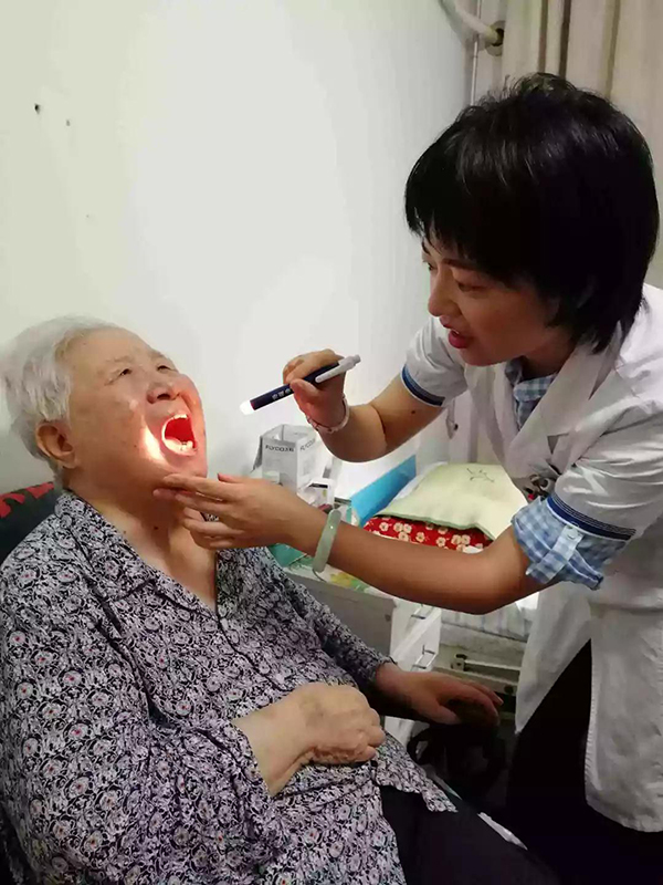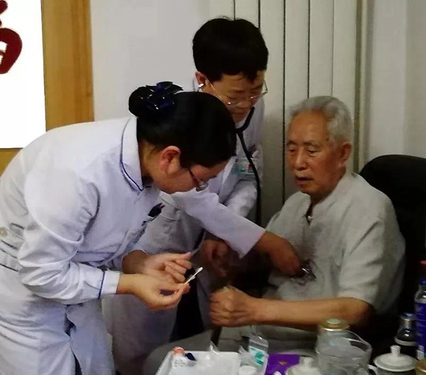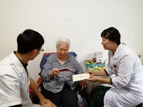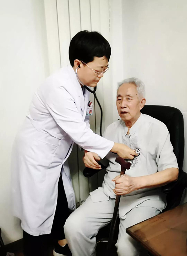 聽說離休支部書記郭陽帶著康復(fù)科醫(yī)護(hù)人員來慰問,她非常高興。蔣老患有高血壓、聽力障礙、因?yàn)槟X梗后遺癥左側(cè)肢體偏癱,生活不能自理,但是思維仍清晰。高麗主任、護(hù)士長吳秀瑋及康復(fù)師左菲菲給予量血壓、測血糖等各項(xiàng)體檢并耐心細(xì)致指導(dǎo)。
