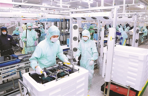 工人們生產(chǎn)電子產(chǎn)品一絲不茍。