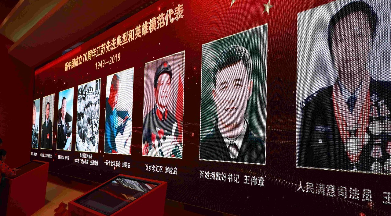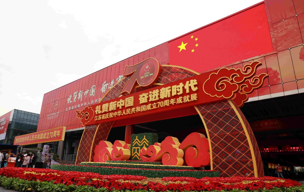 江蘇省慶祝中華人民共和國成立70周年成就展以"禮贊新中國、奮進新時代"為主題,通過綜合展、地方展和室外展3個展區(qū),綜合運用場館展覽、網(wǎng)上展覽、掛圖展示等形式,展出圖片(圖表)2000多張,實物、模型、沙盤100多件(套),視頻及多媒體展品100多件(套),展列228個先進典型和英雄模范人物(集體),用100多個“江蘇第一”“江蘇唯一”和“江蘇之最”,全面展示了中華人民共和國成立70年來黨領(lǐng)導(dǎo)江蘇人民進行建設(shè)、改革和發(fā)展的偉大歷程、巨大成就和寶貴經(jīng)驗。