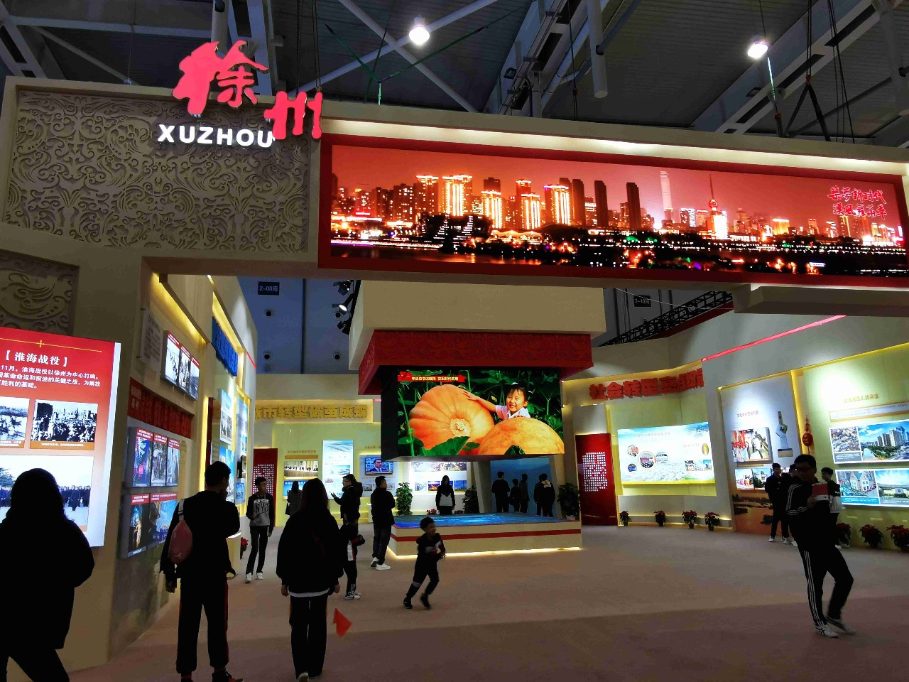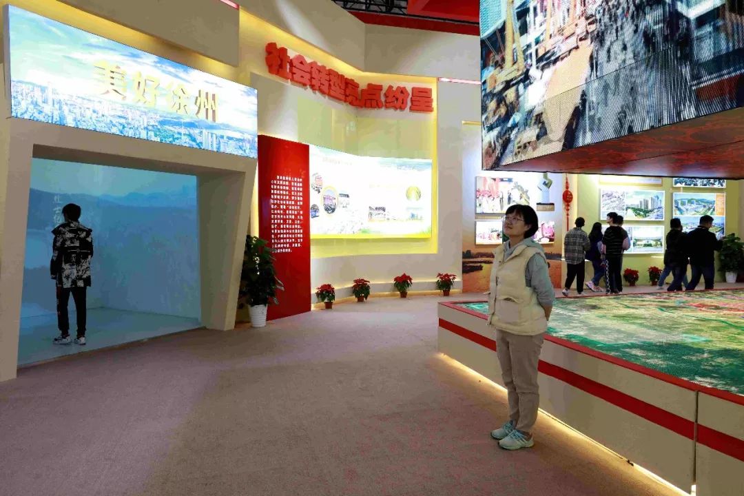 徐州展廳以“筑夢新時代,漢風(fēng)舞華章”為主題,用77張最具代表性的圖片、見證歷史的實物,通過淮海戰(zhàn)役精神傳承、產(chǎn)業(yè)轉(zhuǎn)型鳳凰涅槃、生態(tài)轉(zhuǎn)型華麗轉(zhuǎn)身、城市轉(zhuǎn)型破繭成蝶、社會轉(zhuǎn)型亮點紛呈五個單元,集中展示了新中國成立以來,古彭徐州在淮海戰(zhàn)役精神鼓舞激勵下,克難攻堅、砥礪奮進,經(jīng)濟發(fā)展實現(xiàn)連續(xù)躍升,城鄉(xiāng)面貌發(fā)生翻天覆地的變化,人民生活全面步入小康,老工業(yè)基地浴火重生。