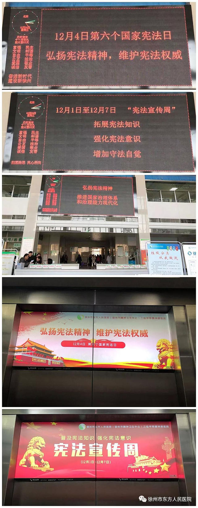 二、營造宣傳氛圍。醫(yī)院12月4日在門診大廳、行政樓的電子顯示屏循環(huán)播放“憲法宣傳周”的主題“弘揚(yáng)憲法精神,推進(jìn)國家治理體系和治理能力現(xiàn)代化”,同時(shí)積極采用電梯內(nèi)廣告位做好“憲法宣傳周”的主題宣傳,營造弘揚(yáng)憲法精神,維護(hù)憲法權(quán)威的宣傳氛圍。