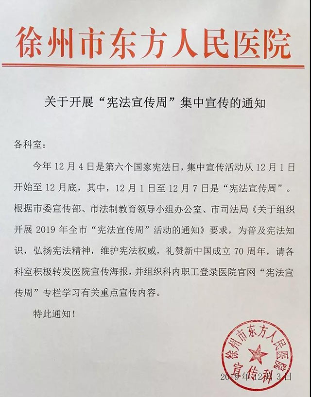 12今年12月4日是第六個(gè)國家憲法日,宣傳活動(dòng)從12月1日開始至12月底,其中,12月1日至12月7日是“憲法宣傳周”。為深入學(xué)習(xí)貫徹黨的十九大和十九屆二中,三中、四中全會(huì)精神,普及憲法知識(shí),弘揚(yáng)憲法精神,維護(hù)憲法權(quán)威,禮贊新中國成立70周年,徐州市東方人民醫(yī)院根據(jù)市委宣傳部、市法制教育領(lǐng)導(dǎo)小組辦公室、市司法局《關(guān)于組織開展2019年全市“憲法宣傳周”活動(dòng)的通知》要求,積極組織開展了形式多樣的集中宣傳活動(dòng)。