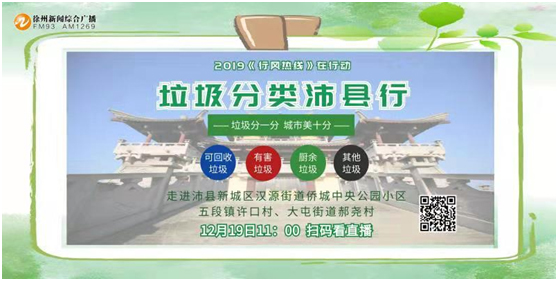 12月19日上午11點,徐州新聞綜合廣播《行風(fēng)熱線》節(jié)目組走進(jìn)沛縣新城區(qū)漢源街道僑城中央公園小區(qū)、五段鎮(zhèn)許口村、大屯街道郝堯村進(jìn)行現(xiàn)場直播,和觀眾一起看一看沛縣小區(qū)如何率先開展垃圾四分類工作,如何變廢為寶的。主持人金誠高訴大家,視頻直播活動將通過開吧和微信公眾號“廣播徐州”視頻直播,歡迎準(zhǔn)時關(guān)注、參與!