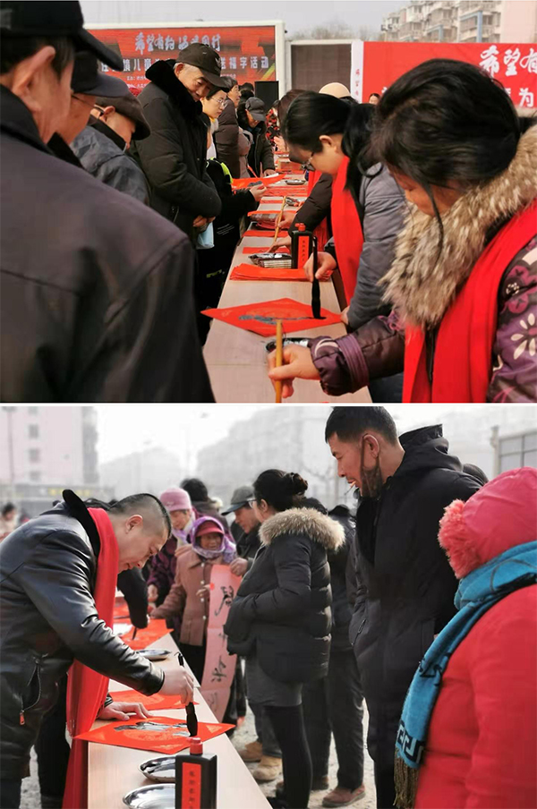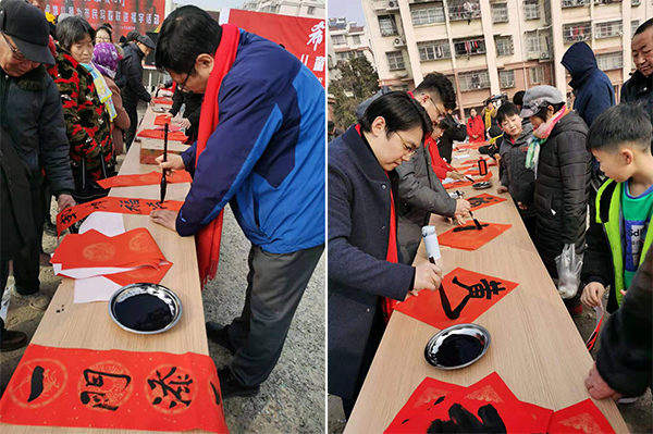 活動現(xiàn)場,共為30名困境兒童贈送新年禮物,32戶最美家庭受到表彰。在活動現(xiàn)場,徐州青年書協(xié)書法家們揮毫潑墨,把新年祝福送給居民,景象熱鬧非凡。同時居民也可以挑選自己心儀的春聯(lián),讓大師們幫忙書寫,將心底的美好祝愿化作一張張?jiān)⒁饧榈臅ㄗ髌。一副副吉祥如意的春?lián),表達(dá)了辭舊迎新的美好祝愿,為即將來臨的春節(jié)增添了濃濃的喜慶氛圍。