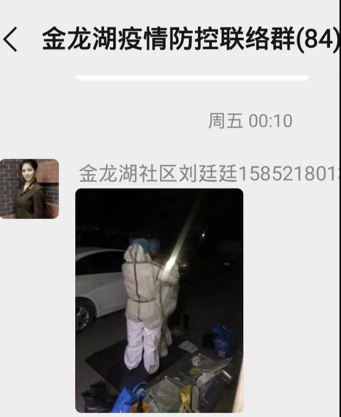 你一定沒見過這樣的“拍姿”。為了完成消殺清潔,勇敢的姑娘在沒有任何防護裝備的情況下,陪著防疫中心工作人員一直戰(zhàn)斗到凌晨。任務完成后,她在群里拍下了這張回復照片。她的名字叫劉廷廷,金龍湖社區(qū)居委會副主任。