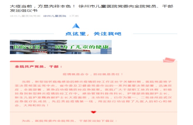 2020年1月29日,徐州市兒童醫(yī)院黨委向全院黨員、干部發(fā)出倡議書(shū):疫情就是命令,防控就是責(zé)任! 要做政治合格的執(zhí)行者,要做沖鋒在前的先鋒者、要做科學(xué)診療的踐行者、要做防范疫情擴(kuò)散的先行者,一張張請(qǐng)戰(zhàn)書(shū)躍然于醫(yī)院黨委領(lǐng)導(dǎo)的辦公桌上。截至2月1日,徐州市兒童醫(yī)院已有263名職工自愿報(bào)名前往武漢疫情防控一線,投身到病毒感染患者的醫(yī)療救治工作中去。他們,有的來(lái)自臨床一線的醫(yī)生、護(hù)士,有的來(lái)自行政后勤職能科室的職工,有的是黨員,有的是群眾,他們是一群最可愛(ài)的人!他們是“請(qǐng)戰(zhàn)者”,更是“勇士”,他們是“逆行者”,筑起防疫的一道道高墻!