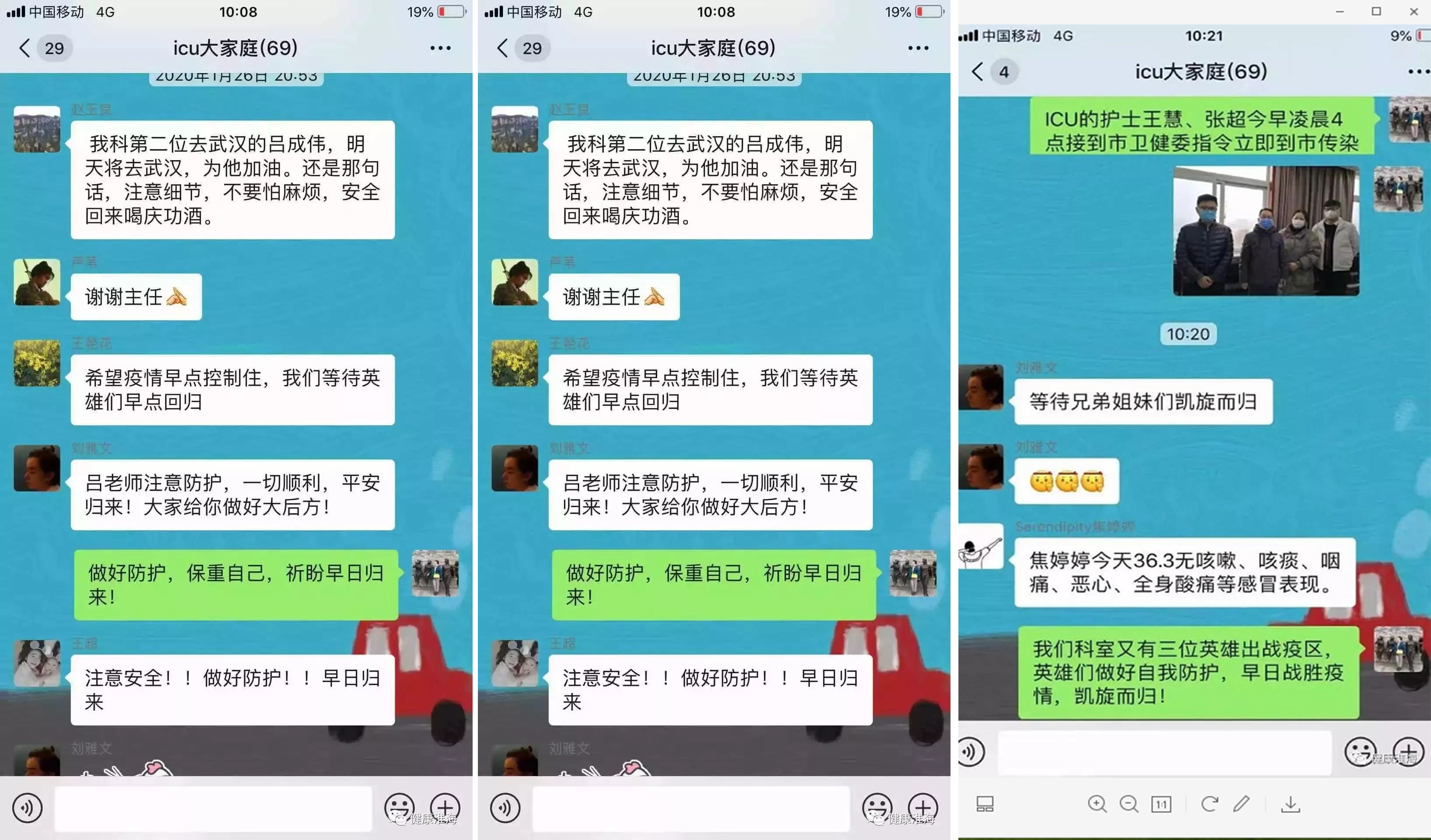 不同的時空,相同的祝福。以上分別是1月25日,1月26日,2月6日在“ICU大家庭”微信群中的發(fā)聲。該群由69位徐州市一院ICU醫(yī)護(hù)組成,他們在得知家庭成員趙偉、呂成偉、王慧、張超和史為濤馳援“疫”線的信息后,徐州市一院ICU主任趙玉良、護(hù)士長胥晶及ICU一眾同仁紛紛表達(dá)著對同伴的關(guān)愛和祝福。