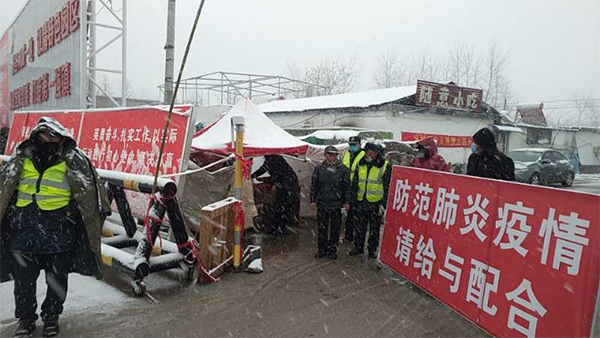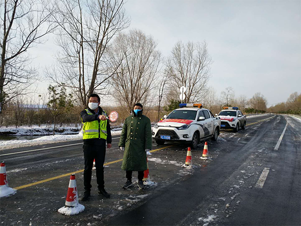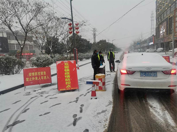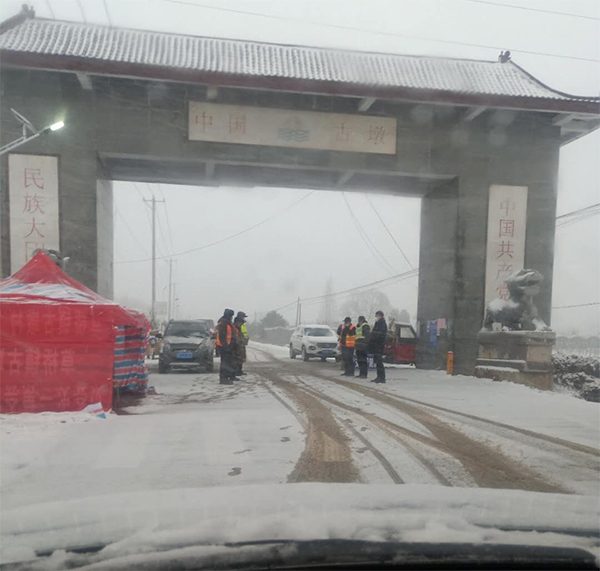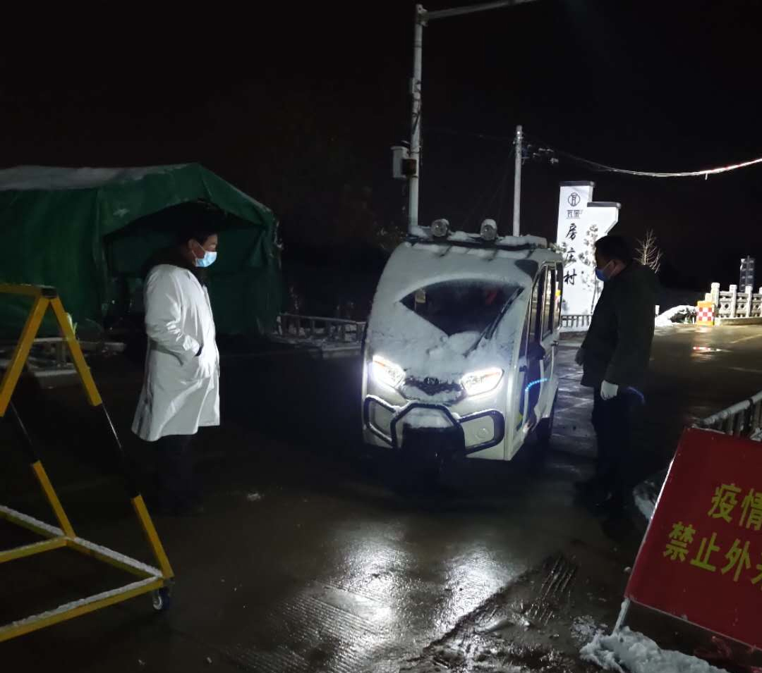 古墩村退役軍人與村干部一起,在疫情防控檢查站頂風(fēng)雪堅(jiān)守崗位,檢查、登記過往車輛行人。