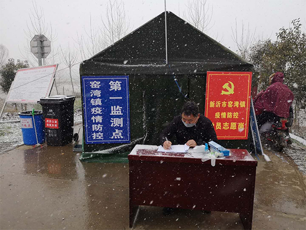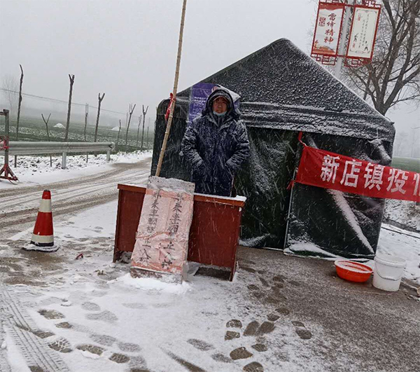 在新店鎮(zhèn)北澗村防疫卡口,退役軍人孫志勇冒著風(fēng)雪堅(jiān)守崗位。