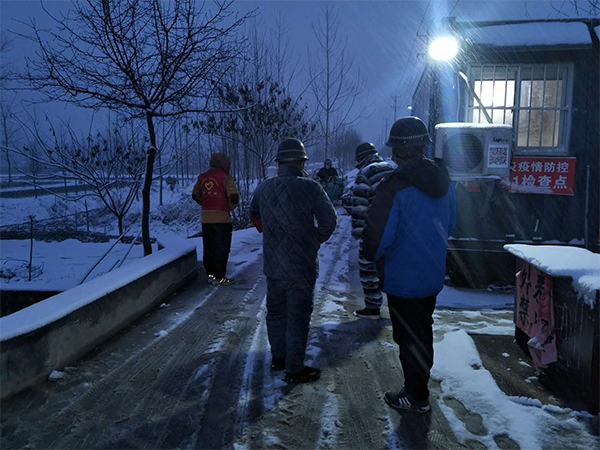 夜幕下,踏著積雪,草橋鎮(zhèn)退役軍人配合鎮(zhèn)村干部、志愿者,在村子里仔細(xì)排查返鄉(xiāng)人員。
