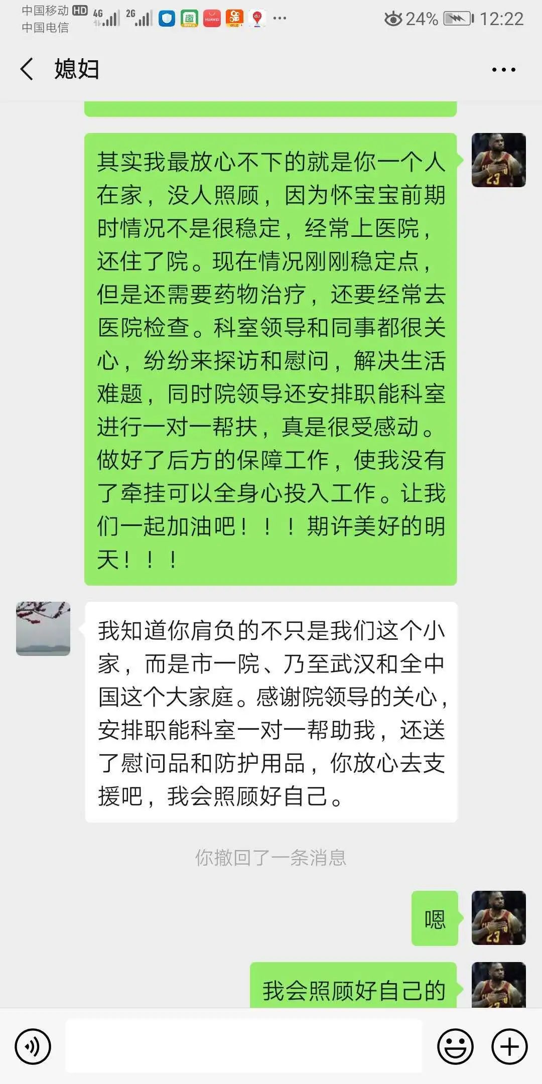 季想成的妻子懷孕4月,在孕前期情況不是很穩(wěn)定,經(jīng)常上醫(yī)院,經(jīng)住院治療后現(xiàn)在剛剛穩(wěn)定,但是還需要藥物治療,還要經(jīng)常去醫(yī)院檢查,但他毅然寫下請戰(zhàn)書。他的父母在外地,為了不讓家人擔心和牽掛,他只把支援武漢的事情告訴了妻子。他說,我是一名醫(yī)務(wù)工作者,扶危渡厄,醫(yī)者擔當是職責(zé)。得知季想成要支援武漢,懷孕4月的妻子縱然心里萬分不舍,但依然毫不猶豫支持季想成的選擇,因為她懂得老公肩負的不只這個小家,而是市一院、乃至武漢和全中國這個大家庭。這是他們從相識相知相愛,第一次離開過對方。在出征武漢前,季想成為妻子準備了充足的生活用品,囑咐她一定要照顧好自己和腹中的寶寶,等他早日凱旋歸來。他把愛人的理解與支持化作前行的動力。
