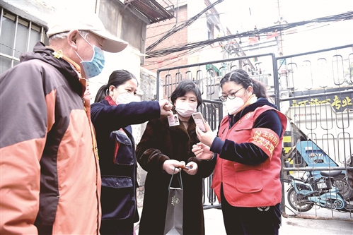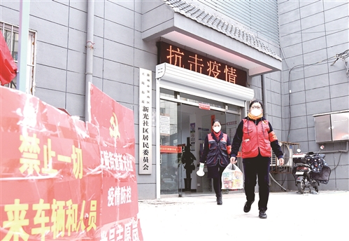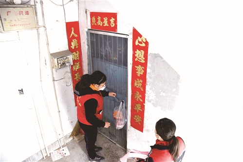 劉雪芹和同事帶著為居家隔離居民準(zhǔn)備的食品,走出社區(qū)居委會(huì)辦公大廳,開(kāi)始一天的工作。