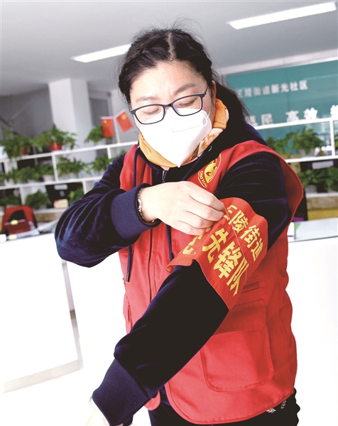 劉雪芹到達(dá)辦公室,穿上志愿者馬甲、戴上黨員先鋒隊(duì)袖標(biāo)。