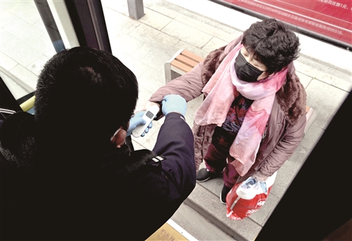 2月28日,公交1路車督導員王向陽對上車乘客進行體溫測量。