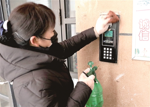 2月28日,開元一期,社區(qū)工作人員定時給小區(qū)樓道電梯噴灑消殺。