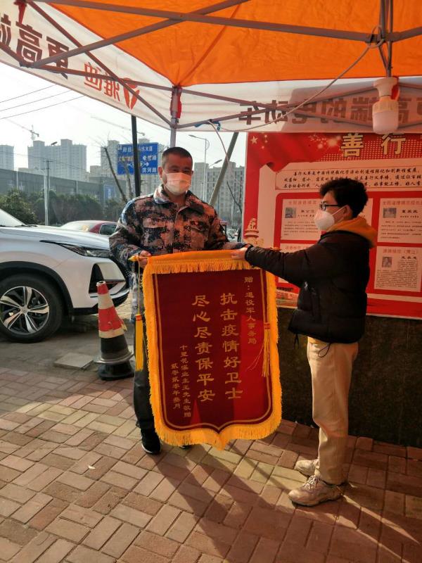 居民劉阿姨感激地說:“面對這次疫情,你們真是我們老百姓的‘守護神’!真是辛苦你們了,看著你們風里來雨里去,我也很心疼,幾次送吃的你們也不要,今天,我們送來錦旗替大家謝謝你們。”這幾句樸實又暖心的話語,抹去了李德科連日來的疲憊,露出了幸福的笑容。(陳雪水)