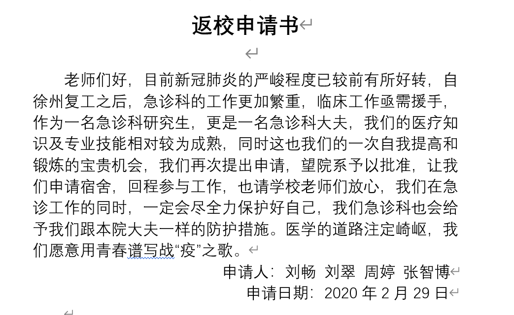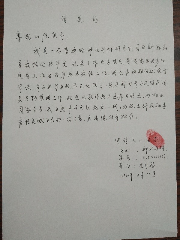 “醫(yī)學(xué)的道路注定崎嶇,我們愿意用青春譜寫戰(zhàn)‘疫’之歌”。2018級急診專碩研究生劉暢、劉翠、周婷和張智博在請戰(zhàn)書上這樣寫道。在得知徐州復(fù)工,急診科的工作更加繁重后,他們兩次請纓表示要返校和科室的老師們一起投入對疫情的戰(zhàn)斗中去,因為他們知道,他們此時的身份不只是急診科研究生,更是急診科醫(yī)生!在得知國家新冠肺炎疫情日趨嚴(yán)重,抗疫工作任務(wù)艱巨,前線需要更多醫(yī)務(wù)工作者,本科就讀于軍校,參與過軍事預(yù)防生化演習(xí),參與過國慶閱兵后勤保障工作的2018級神經(jīng)外科專碩研究生汪忠,認(rèn)為此時的他,比任何人都更有理由參加到抗疫的前線中去,懷著一腔熱血,向醫(yī)院寫下了請愿書。這是為國家和社會做貢獻的時刻,也是一次提高和鍛煉自我,更好地服務(wù)病患的寶貴機會。穿上白大褂,他們就是白衣天使,脫下白大褂,他們只是一群孩子,但是有理由相信,擁有這份仁心,他們會成為優(yōu)秀的醫(yī)者!