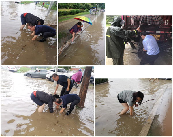 在白云東路與高架橋交叉口,積水嚴(yán)重,容易造成機(jī)動(dòng)車熄火,工作人員徒手清除堵塞井蓋的雜物,疏通排水口,現(xiàn)場(chǎng)指引來(lái)往車輛。