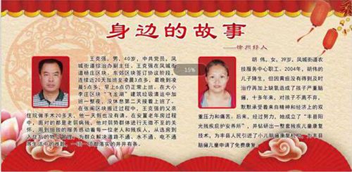 開發(fā)區(qū)干部王克強,最早被列入文化墻好人榜。他在街道負責群眾搬遷工作,經(jīng)常24小時連軸轉(zhuǎn)。7年前,因患腦瘤被揭開頭蓋骨,醫(yī)生叮囑他病好也要休息三年,他不聽醫(yī)生建議和單位領導同事的勸告,依然堅守崗位多年;為了群眾的搬遷工作,他戰(zhàn)酷暑、冒嚴寒、披星戴月、廢寢忘食上門為老百姓服務。因傷口感染,多次昏倒在工作現(xiàn)場;他堅持帶病完成搬遷任務,這樣一位愛崗敬業(yè)的工作“強人”,曾被評為“有情有義豐縣人”。