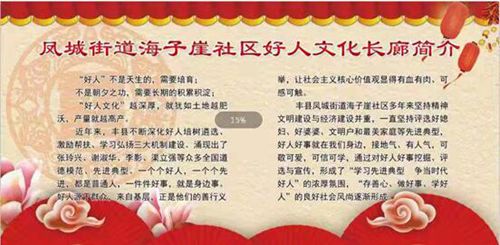 近年來,鳳城街道以“培育好人文化、傳承好人精神、放大好人效應”為主線,廣泛開展道德模范、身邊好人和“有情有義豐縣人”上墻宣傳活動。通過打造好人廣場、好人公園、好人榜、好人長廊等方式,同時邀請道德模范走進道德講堂開展宣講。通過“小鏡框”宣傳欄,折射出正能量。如今在鳳城街道涌現(xiàn)出愈來愈多的像王克強、顧忠艷這樣的好人。