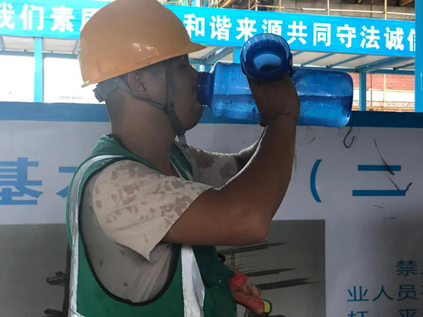 從六點(diǎn)半開始出工到十點(diǎn)鐘,李德建已經(jīng)工作了近四個(gè)小時(shí),他拿起身邊一個(gè)五六百升的水杯仰起頭猛喝幾口。豆大的汗珠順著臉頰滴下來,身上的衣服能擰出水來。