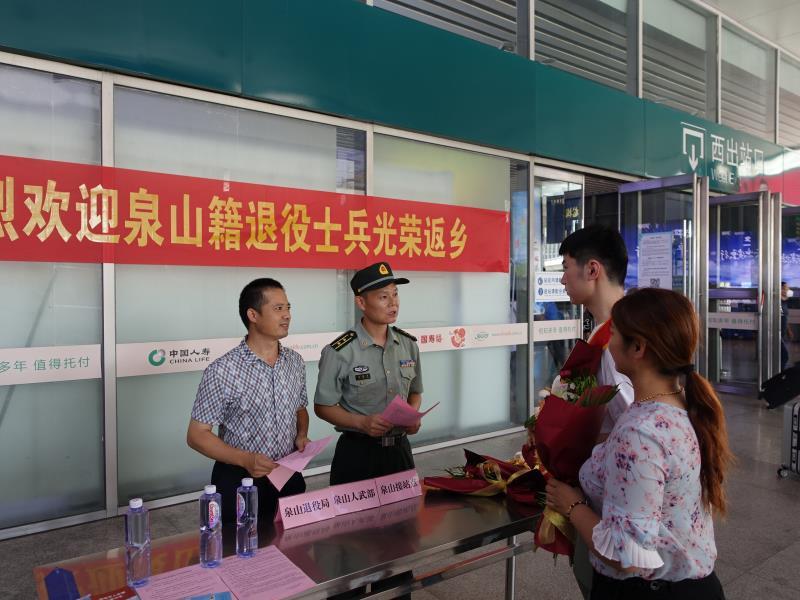 二是設立接待站點。在高鐵徐州東站西出站口設立接待服務站,懸掛“熱烈歡迎泉山籍退役士兵光榮返鄉(xiāng)”橫幅標語,提供飲水休息服務,開展返鄉(xiāng)報到業(yè)務引導工作,并解答相關政策咨詢。