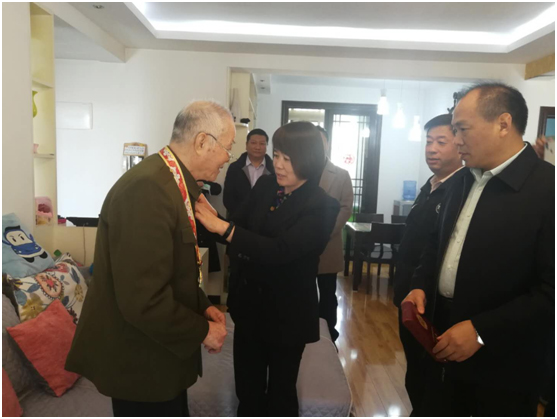 黃淮網(wǎng)  10月23日,徐州市云龍區(qū)副區(qū)長李朝霞,云龍區(qū)退役軍人事務(wù)局局長劉春立、黃山街道黨工委書記于尊嶺一行帶隊為李樹、王忠祥等20位抗美援朝老戰(zhàn)士頒發(fā)了以中共中央、國務(wù)院、中央軍委名義頒發(fā)的“中國人民志愿軍抗美援朝出國作戰(zhàn)70周年”紀念章,并表達了區(qū)委區(qū)政府對他們的親切問候和崇高敬意。