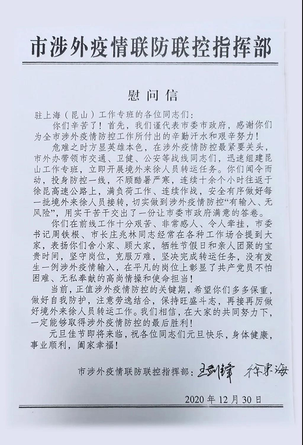一封特殊的慰問(wèn)信 致敬徐州第一人民醫(yī)院赴昆山疫情常態(tài)化防控工作專(zhuān)班的白衣天使