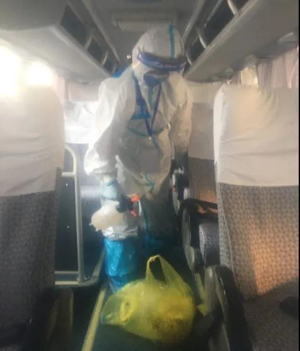 在轉(zhuǎn)運(yùn)途中,一名女孩因路途顛簸,身體抱恙發(fā)生嘔吐,共產(chǎn)黨員馬麗偉立即趕到其身邊給予幫助,并迅速對(duì)嘔吐物進(jìn)行消殺封閉。隨后為其更換口罩,遞上礦泉水漱口,并妥善安置,細(xì)心照顧。