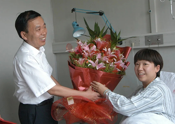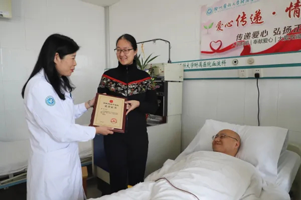 前一天上午,在同一張病床上,徐州市第100例造血干細(xì)胞捐獻(xiàn)者王擘在此完成捐獻(xiàn),與他配型成功的是外省一位11歲的白血病患者。徐州市副市長、市紅十字會(huì)會(huì)長李燕在我院常務(wù)副院長金培生的陪同下前來探望王擘,并為他頒發(fā)榮譽(yù)牌。