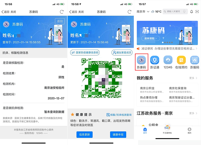 Q:如何得知檢測結(jié)果檢測機構(gòu)及時將檢測結(jié)果通知檢測對象。你也可以通過蘇康碼查詢檢測結(jié)果。登錄江蘇政務(wù)服務(wù)app,首頁點擊“蘇康碼”,點擊“核酸/抗體檢測查詢”↓
