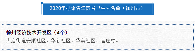 日前,江蘇省衛(wèi)生健康委員會(huì)發(fā)布關(guān)于2020年擬命名江蘇省衛(wèi)生鎮(zhèn)、衛(wèi)生村的公示,徐州經(jīng)開(kāi)區(qū)共4個(gè)村(社區(qū))榜上有名,皆被大廟街道收入“囊中”,分別是安順社區(qū)、華新社區(qū)、華美社區(qū)、官莊村。