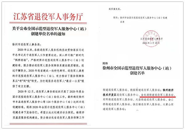 徐州經(jīng)開區(qū)金龍湖街道退役軍人服務(wù)站榮獲全國“示范型退役軍人服務(wù)中心(站)”