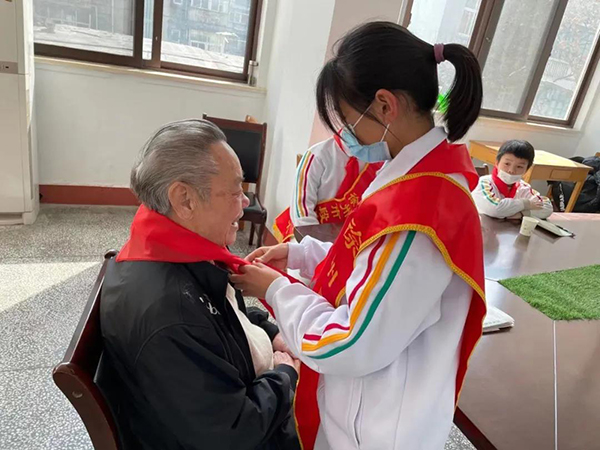 在徐礦集團(tuán)老干部處,王興才親切接待了少先隊(duì)員們,少先隊(duì)員代表為王爺爺戴上紅領(lǐng)巾,并同王爺爺相互敬禮。