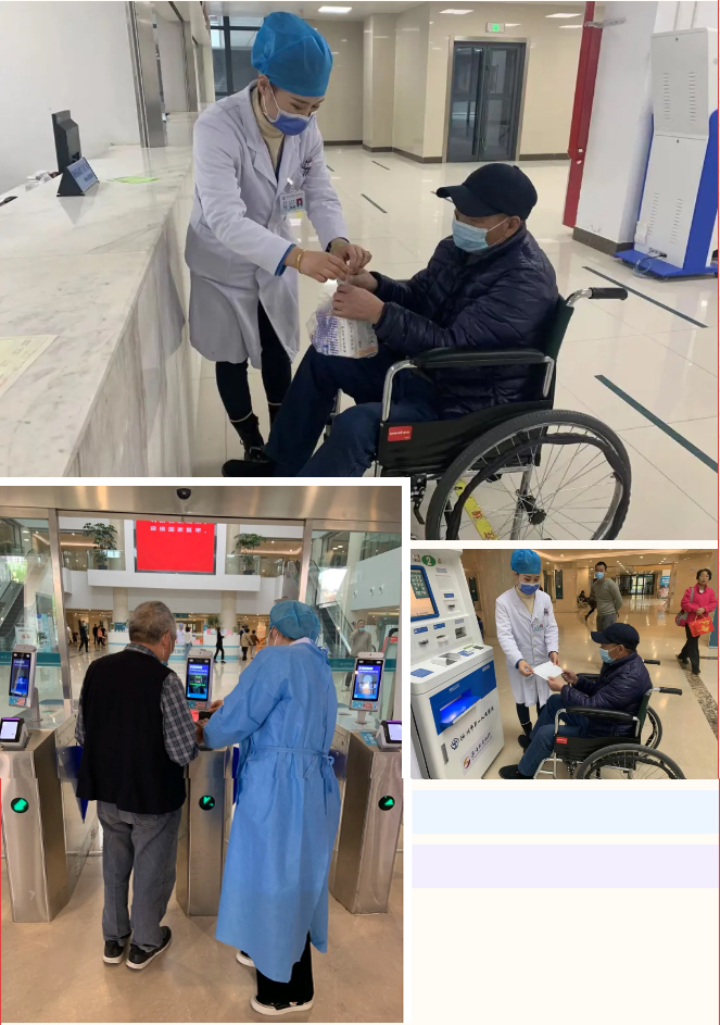 設(shè)置無需掃碼人工通道、老年人優(yōu)先掛號(hào)窗口,增設(shè)門診導(dǎo)醫(yī)人員和志愿者協(xié)助自主掛號(hào),一站式服務(wù)中心便民小站,提供擔(dān)架、助步器、拐杖和輪椅,協(xié)助無陪護(hù)或行動(dòng)不便的病人檢查、繳費(fèi)、取藥和聯(lián)系其親屬服務(wù)......時(shí)長(zhǎng)由幾秒延至幾分鐘,節(jié)奏從緊湊到遲緩,這些服務(wù)內(nèi)涵和方式的轉(zhuǎn)變看似微小,卻將來自陌生后輩對(duì)銀發(fā)老者的關(guān)愛送達(dá)、擴(kuò)散。