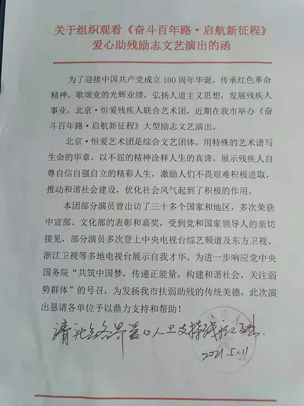 黃淮網(wǎng)  為迎接建黨100周年,傳承紅色革命精神,歌頌黨的光輝業(yè)績,北京•恒愛殘疾人聯(lián)合藝術團大型勵志文藝演出《奮斗百年路 啟航新征程》,將于6月9號晚間7點30分在徐州市音樂廳拉開帷幕。50多名演職人員將帶來舞蹈《龍騰盛世&舞獅》、歌伴舞《春天的故事》、口書表演、疫情詩朗誦《因為有你》、手語舞《唱支山歌給黨聽》等,用特殊的藝術譜寫生命的華章,以不屈的精神詮釋人生的真諦,展現(xiàn)殘疾人自尊自信自強自立的精彩人生,激勵人們不畏艱難,積極進取,推動和諧社會建設。