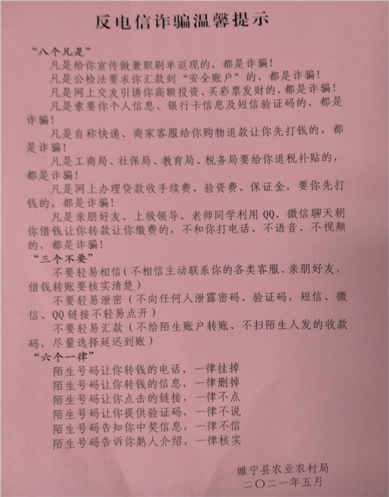 睢寧縣農(nóng)業(yè)農(nóng)村局進(jìn)村入戶開展反電信詐騙宣傳活動(dòng)