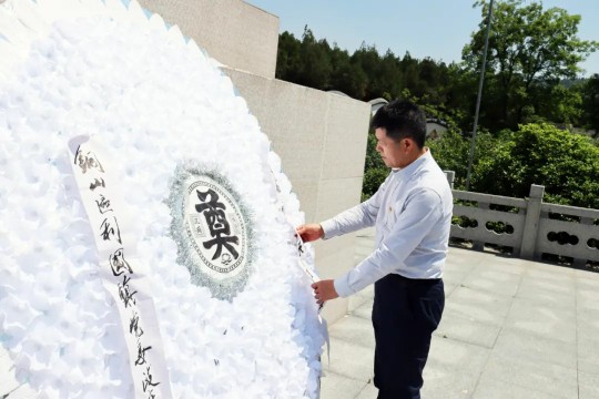 ▲鎮(zhèn)黨委書記李道峰緩步上前,在花圈前駐足肅立,仔細整理花圈緞帶。