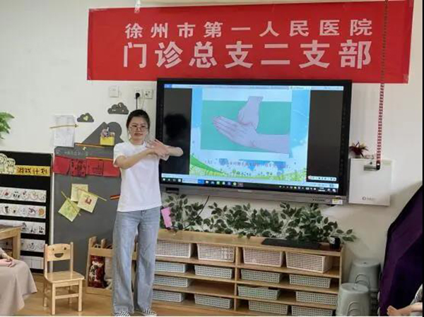 活動(dòng)最后,第一黨小組黨員周楠同志為老師和孩子們講解了“七步洗手法”要領(lǐng),指導(dǎo)他們掌握正確的洗手方法,引導(dǎo)孩子們?cè)谏钪叙B(yǎng)成勤洗手、講衛(wèi)生的好習(xí)慣。