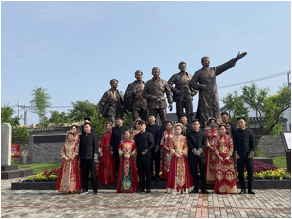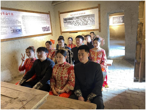 在集體婚禮儀式結(jié)束后,漢興街道組織新人到紅色資源基地——大屯街道宋莊,現(xiàn)場接受紅色資源學習教育。