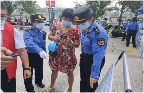 新城區(qū)執(zhí)法大隊在漢源劉園社區(qū)核酸檢測點志愿服務(wù)
