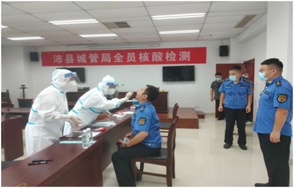 黃淮網(袁捷) 7月31日,沛縣城管局邀請沛縣中醫(yī)院醫(yī)護人員來到城管局,為全體城管人員開展新冠病毒核酸檢測工作,全面落實“可知可控,精準防控”的疫情防控工作要求,進一步筑牢全局疫情防控工作安全防線。