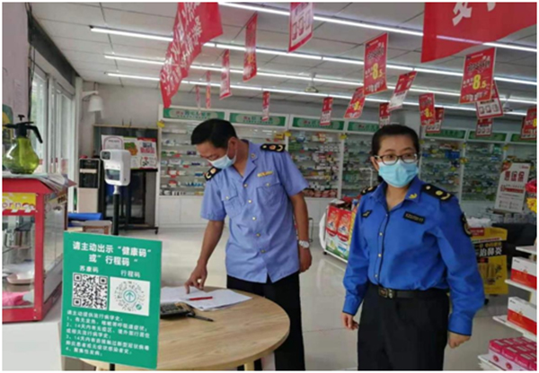 城管執(zhí)法人員認(rèn)真檢查居民健康碼和行程碼